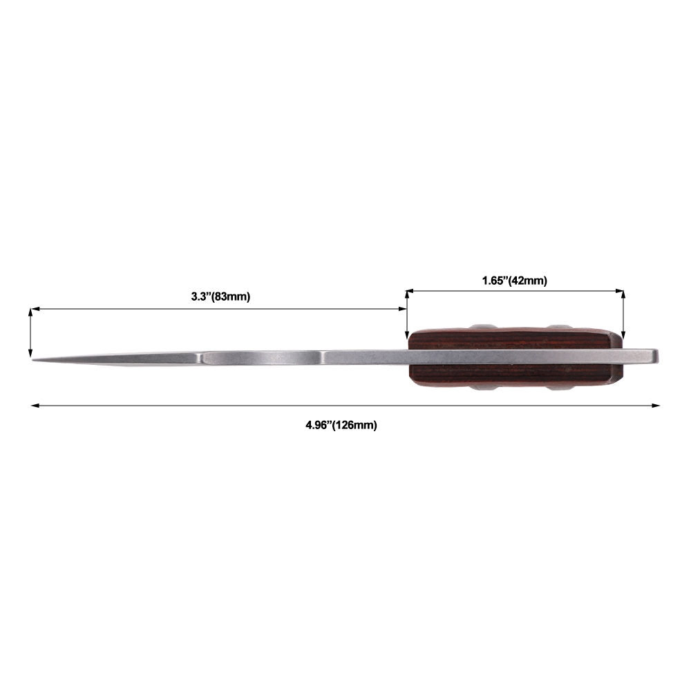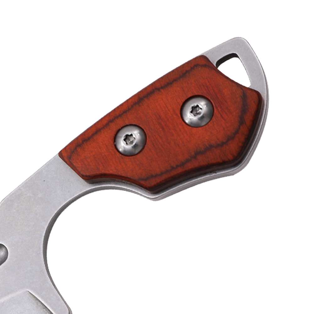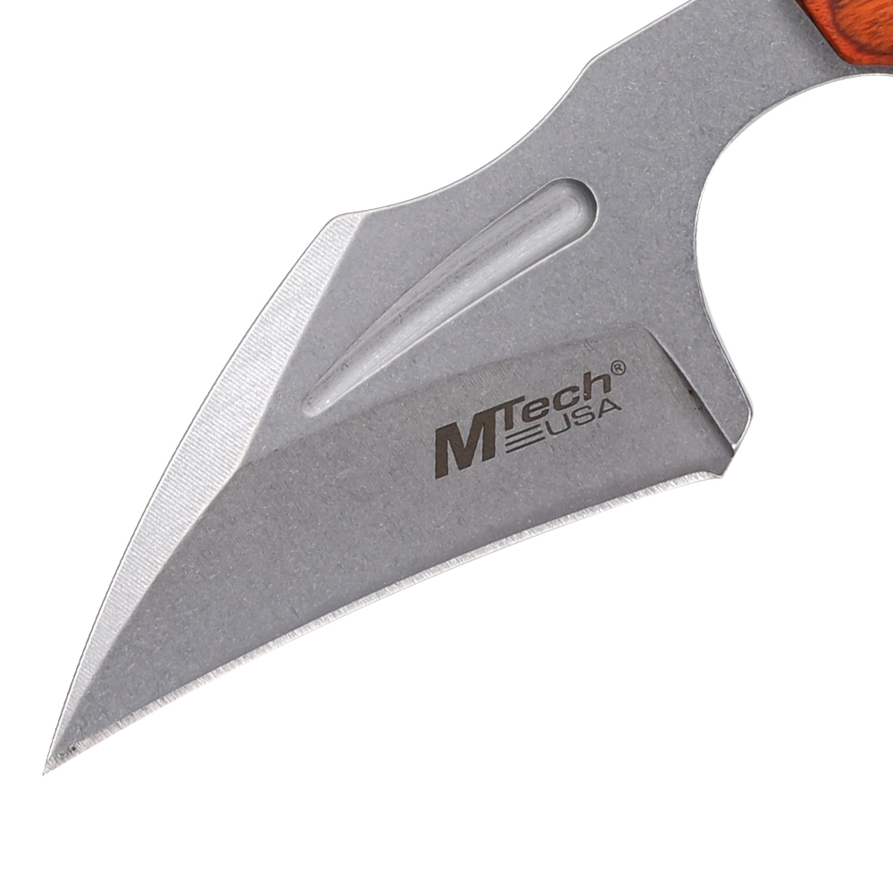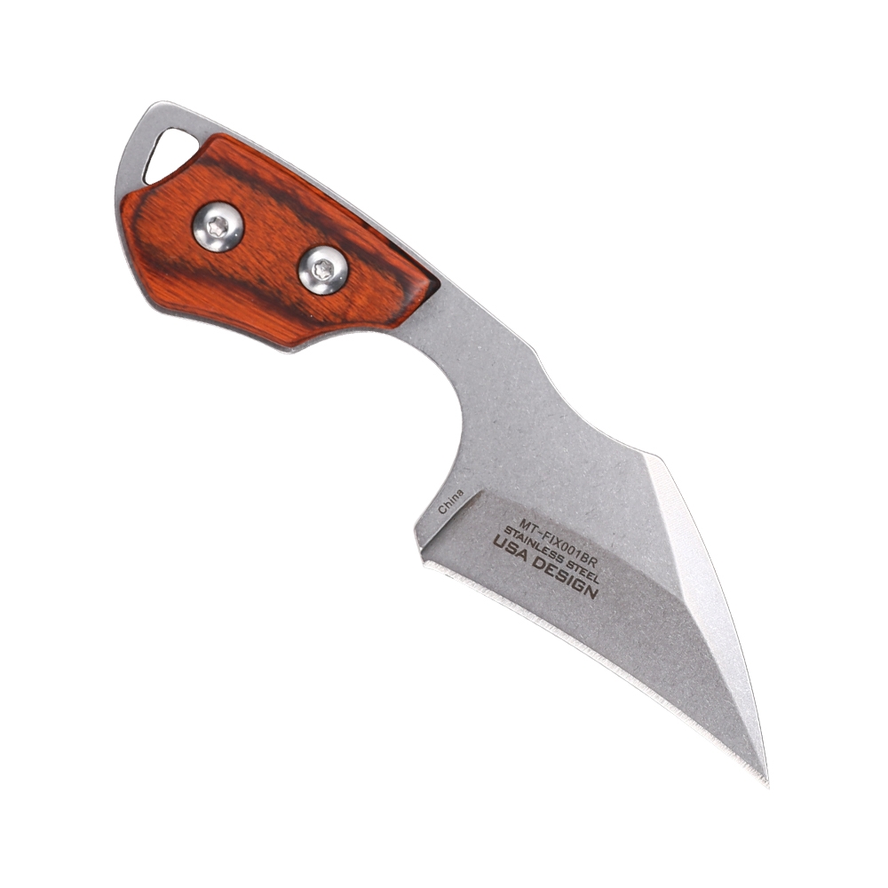 MTech Fixed Blade Overall: 4.96" Blade: 3.30" Steel: 3Cr13MoV Edge: Fine Finish: Satin Handle: 1.65" Material: Stainless Steel w/ Wood Scales Sheath: Molded ABS w/ Breakaway Chain Features: Full Tang Construction