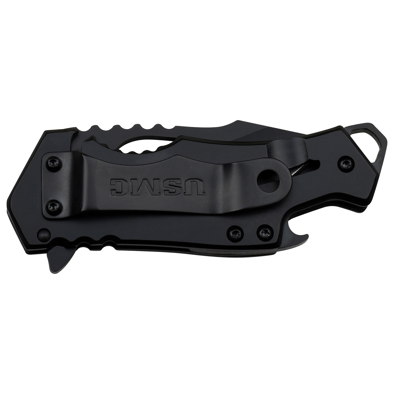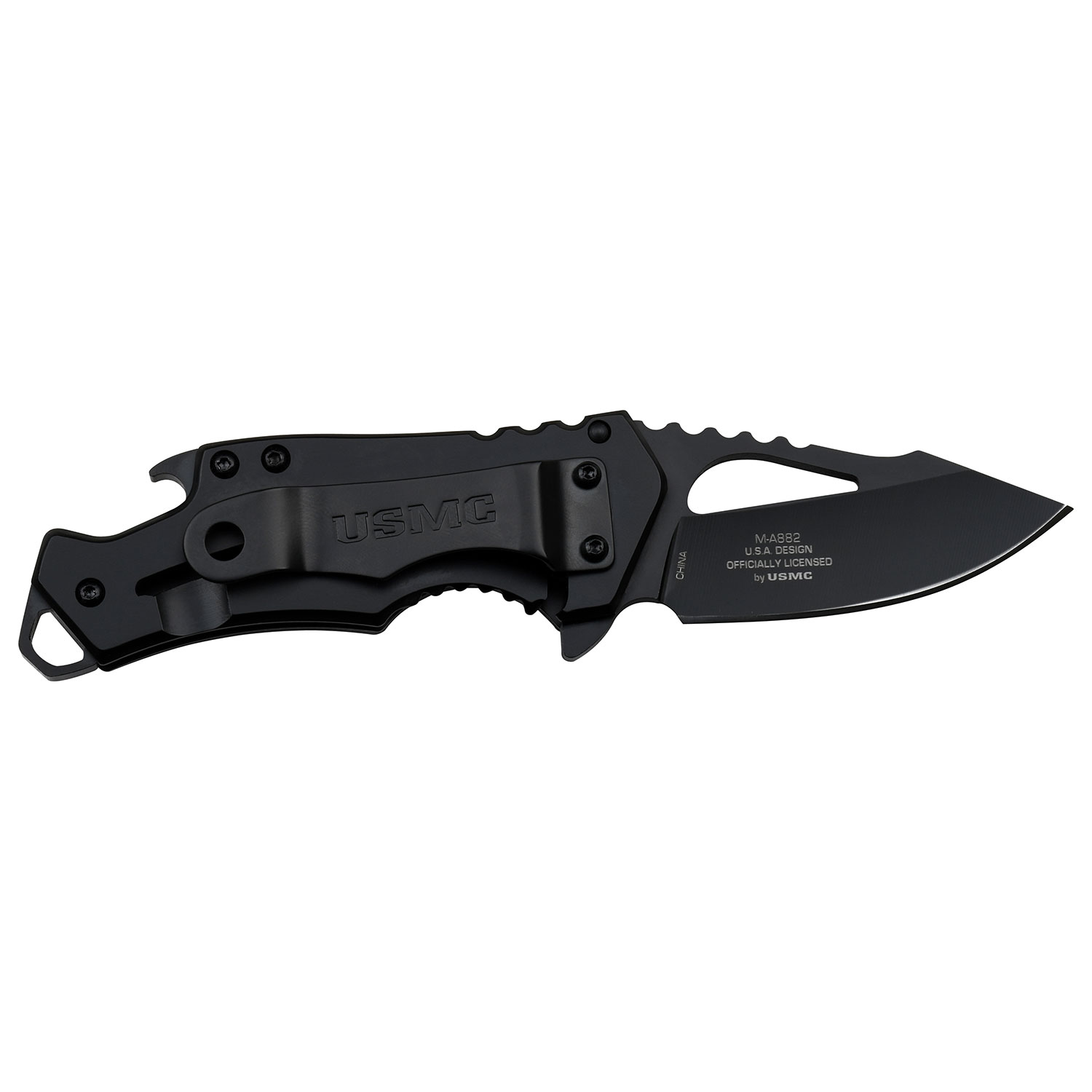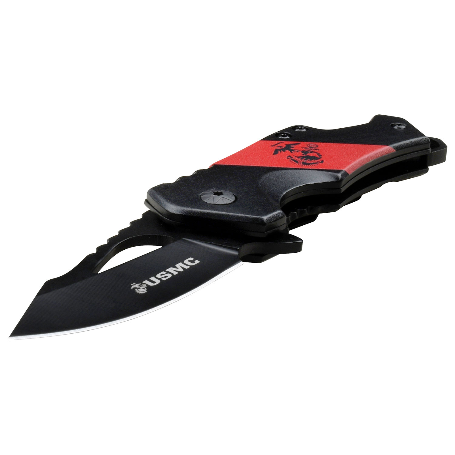 SPECIAL FEATURES: Black and Red Aluminum Handle with US Marines Graphic, Frame Lock, Bottle Opener, Pocket Clip.